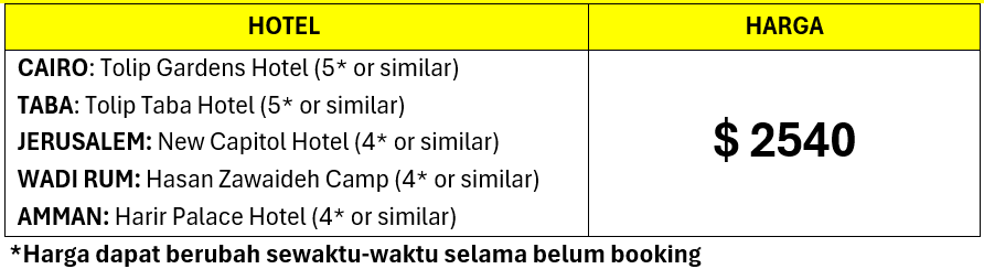 Sarapan di hotel lalu check-out. Melanjutkan perjalanan menuju Taba border. Proses imigrasi dari wilayah Mesir dan memasuki wilayah imigrasi Israel. Setelah selesai proses imigrasi, bertemu dengan guide warga palestina berbahasa Indonesia. Melanjutkan perjalanan menuju Jericho. Makan siang di restoran. Mengunjungi Maqam Nabi Musa AS. Melanjutkan perjalanan menuju Jerusalem. MengunjungiMaqam Rabeiah El Adawiyah, Maqam Salman Al-Farisi, dan Mt. Olive. Check-in hotel, makan malam di hotel, dan bermalam di Jerusalem.